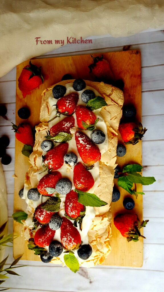 When Asheera asked me to do the guest post i was wondering what shall i give to her beautiful space! I approached her to know if she has any specific recipe type in her mind like savory or sweet, to which she immediately replied by saying she always prefer sweet! How sweet hehe! So i thought i should give my best !And here it is, one of my most favorite dessert in roulade form!Yes my favorite Pavlova! Berry Meringue Roulade is a melt in mouth deliciousness with a crispy crust and fluffy inside!To see the detailed recipe hop to her space Asheescookbook.