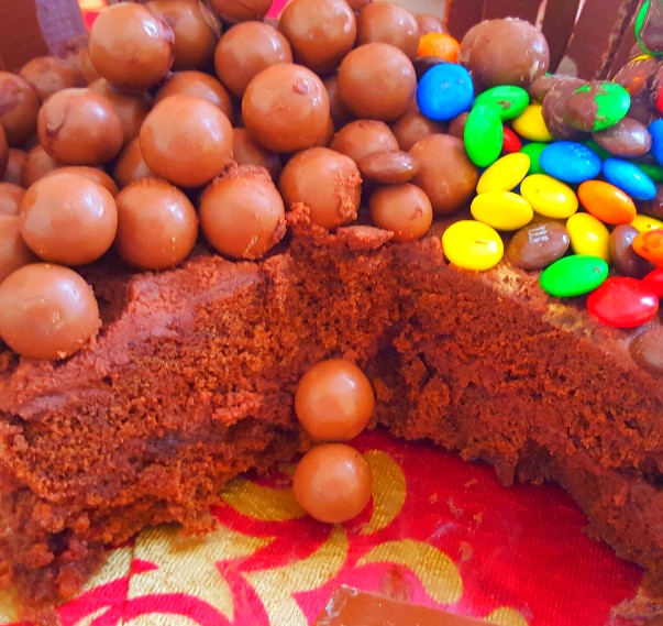 - Put maltesers on one side of the cake and m&ms on other side.Arrange it nicely use candies to fill the gaps.