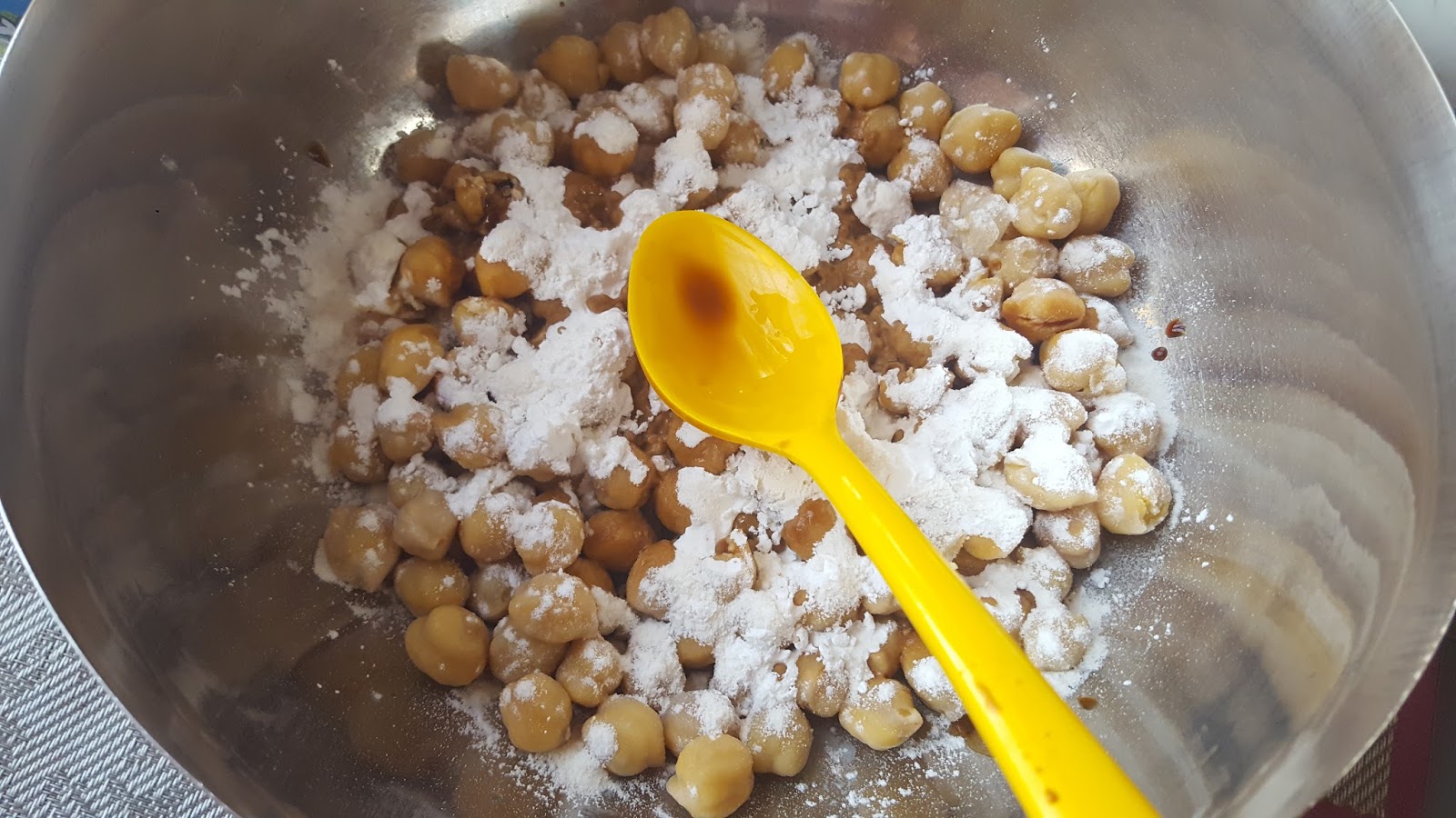 - In a deep bottom, pan pour some oil and dump in the coated chickpea and shallow fry it until lightly golden and crisp. Stir it in between with light hands,but don’t mash it.
