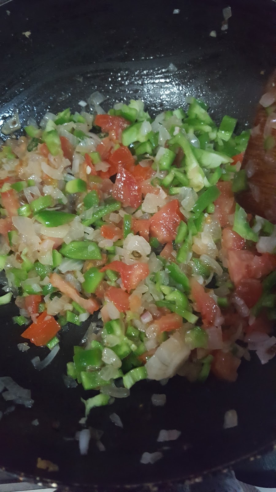 - Then add finely chopped tomato and capsicum cook for few minutes until the veggies are slightly tender.