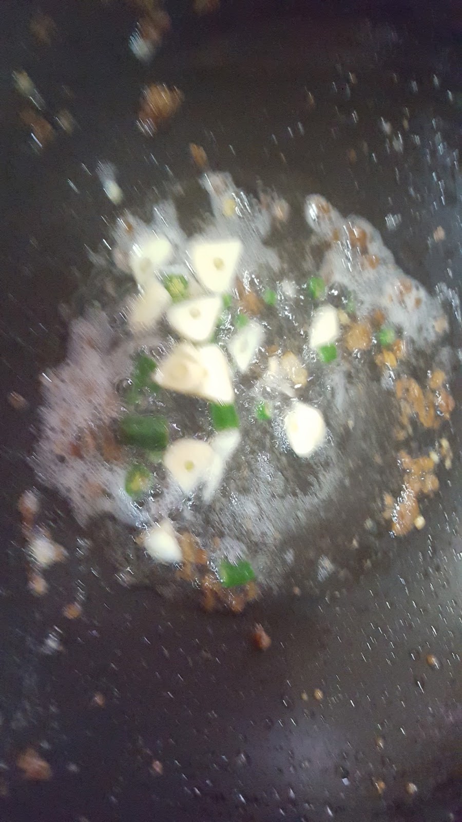 - In the same oil add finely chopped garlic and green chilies saute for few minutes