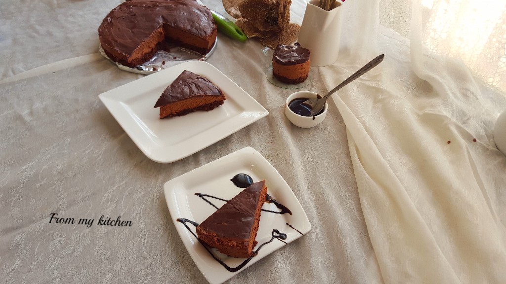 Base is  a thin layer chocolate sponge,then rich creamy mousse with only chocolate and whip cream then chocolate ganache.And this dessert will be wiped out with no time.Try it out its very simple and elegant.