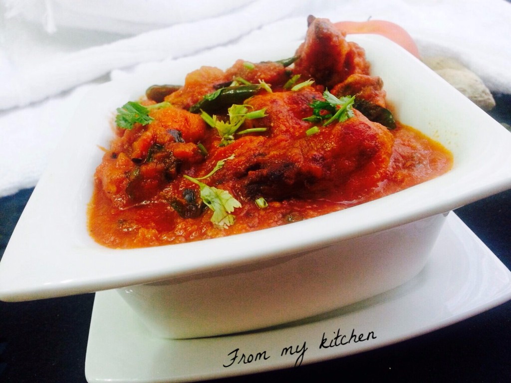 Fried chicken in a spicy tomato gravy!I made it in Indian style(I mean chicken fried in a light crispy spicy coating) and it was super yumm!First boiled chicken with some spices and then coated it with some flour and cornflour to get a crispy coating and shallow fried it.Then made a spicy tomato gravy and mixed it up all.slurp!