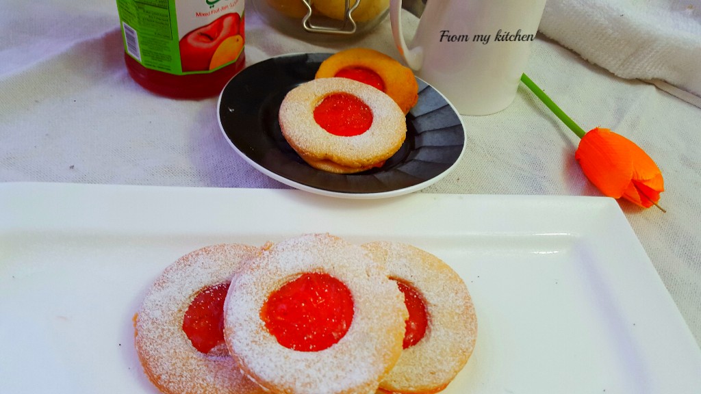 A sandwich biscuit filled with mixed fruit jam!Sandwich biscuits are about contrast weather its texture or flavours.It was real fun to make and enjoyed by the kids.With a single bite we will fall in love with this red and white beauties.Crispy biscuits with the jam oozing out!
