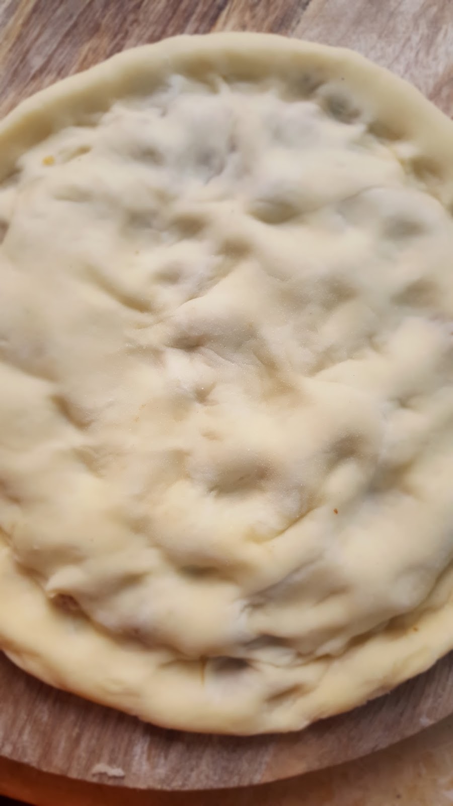 3.Now cover it with other disc.Tuck it inside and make a dent with you fingers like shown in the picture.Start pressing the dough from the centre with the tip of your fingers and make it even.Apply egg wash sprinkle some sesame seeds on top.and bake it on a preheated oven at 180 degree for 20 minutes.