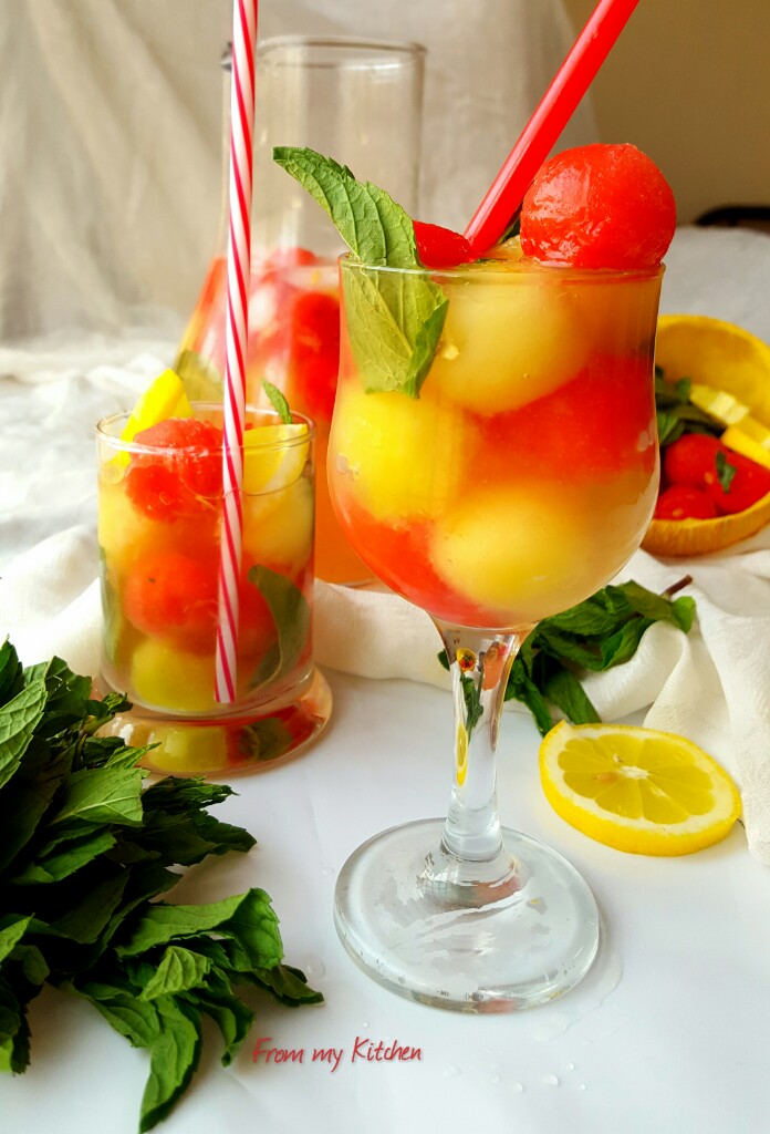 Summer calls for refreshing and soul soothing drinks!Only thing i love about the summer is that we can have lots of cool drinks and ice creams!This one is a killer.Really this is such an amazing drink with the freshness of lemon and mint along with frozen melon balls!Just try it out guys!The flavorsinfused by the melons in that classic mojito is divine.