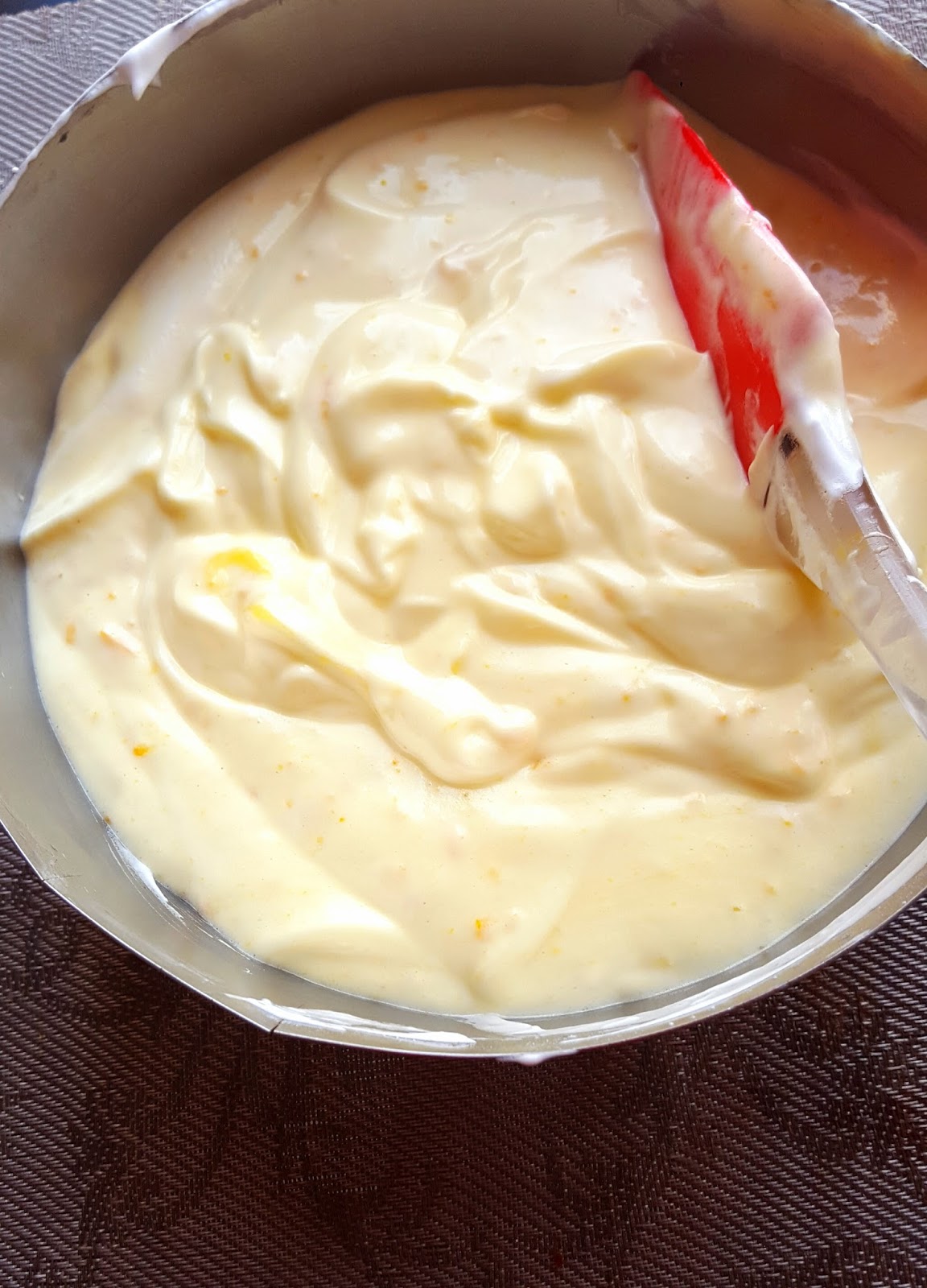 - Then add orange juice and sugar and stir continuously(stir it immediately otherwise it has a chance to curdle)Add orange zest and stir until whole mixture come together.like this
